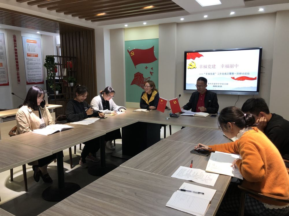 为建设丽华中学党建品牌,坚持党对学习各项教育教学工作发展的引领,增强教师、学生的幸福感,2020年10月21日下午4时,丽华中学“幸福党建”工作室在二楼党员活动室开展工作室成立暨第一次研讨会。会议由办公室副主任王云主持,党支部书记丁连伟、工作室全体成员参加了本次会议。