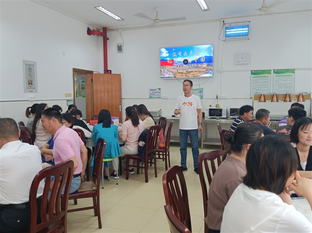在嘹亮的歌声的中,飞机编队呈100字样飞跃天安门广场;10道彩烟辉映,国旗护卫队伴随百响礼炮走过红毯。升旗仪式开始,报告厅内的所有老师肃立注目,凝视屏幕中的国旗,高唱国歌。大家共同聆听了民主党派代表的热切祝福、共青团员和少年队员代表的铿锵宣言,热烈的掌声在报告厅内响起,所有党员、入党积极分子专注聆听、凝神学习习近平总书记重要讲话!
